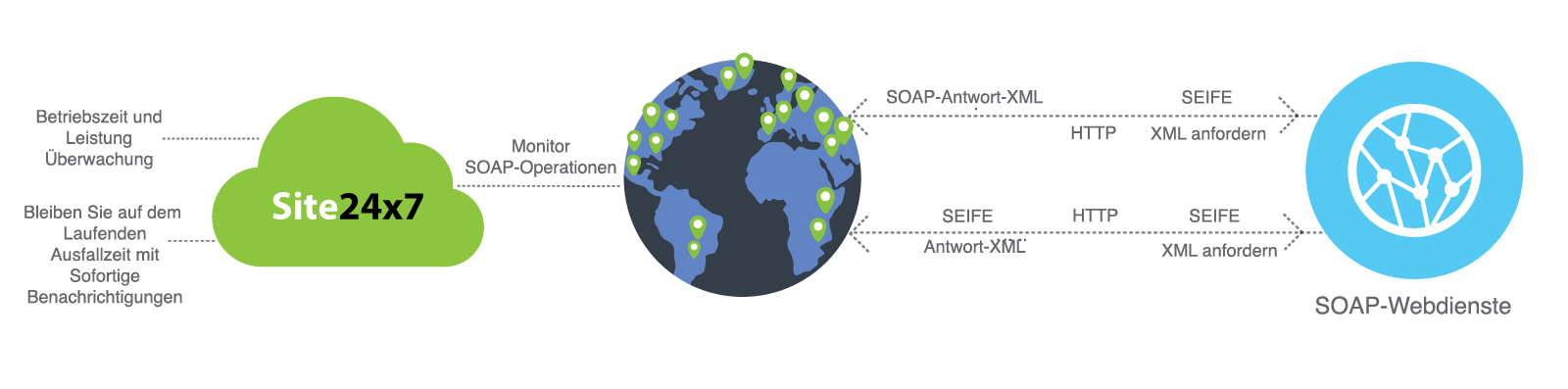Überwachen Sie SOAP-Webservices kontinuierlich und bleiben Sie mit Sofortbenachrichtigungen über Voice, SMS, E-Mail, RSS-Feeds oder Push-Benachrichtigungen bei einem Ausfall auf dem aktuellen Stand.