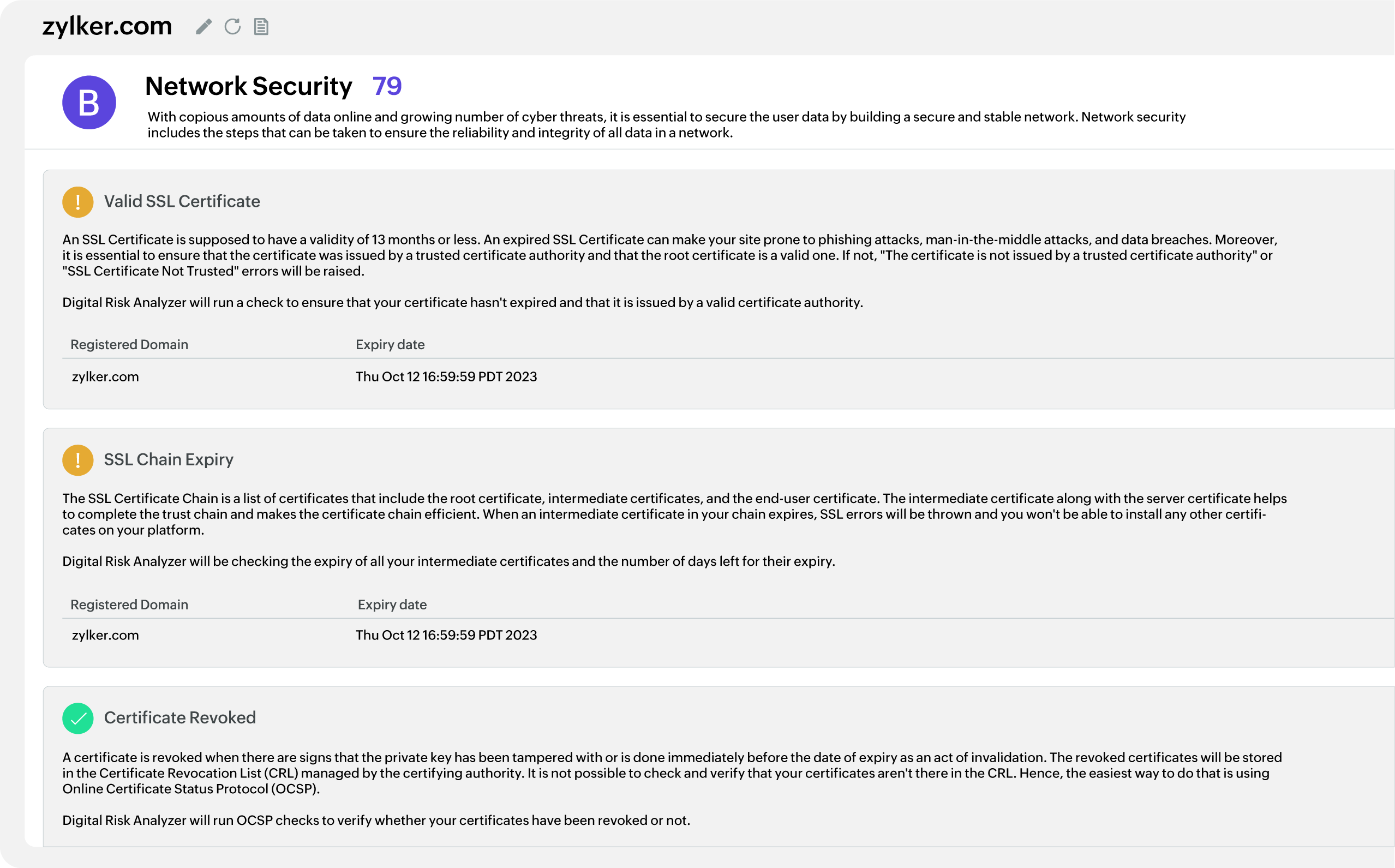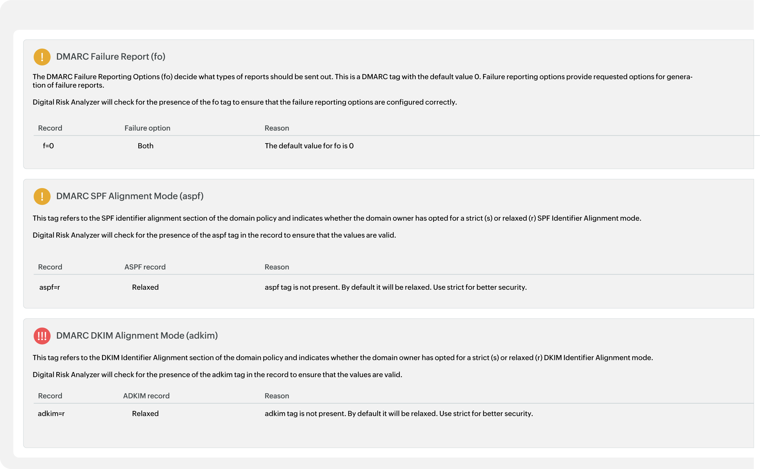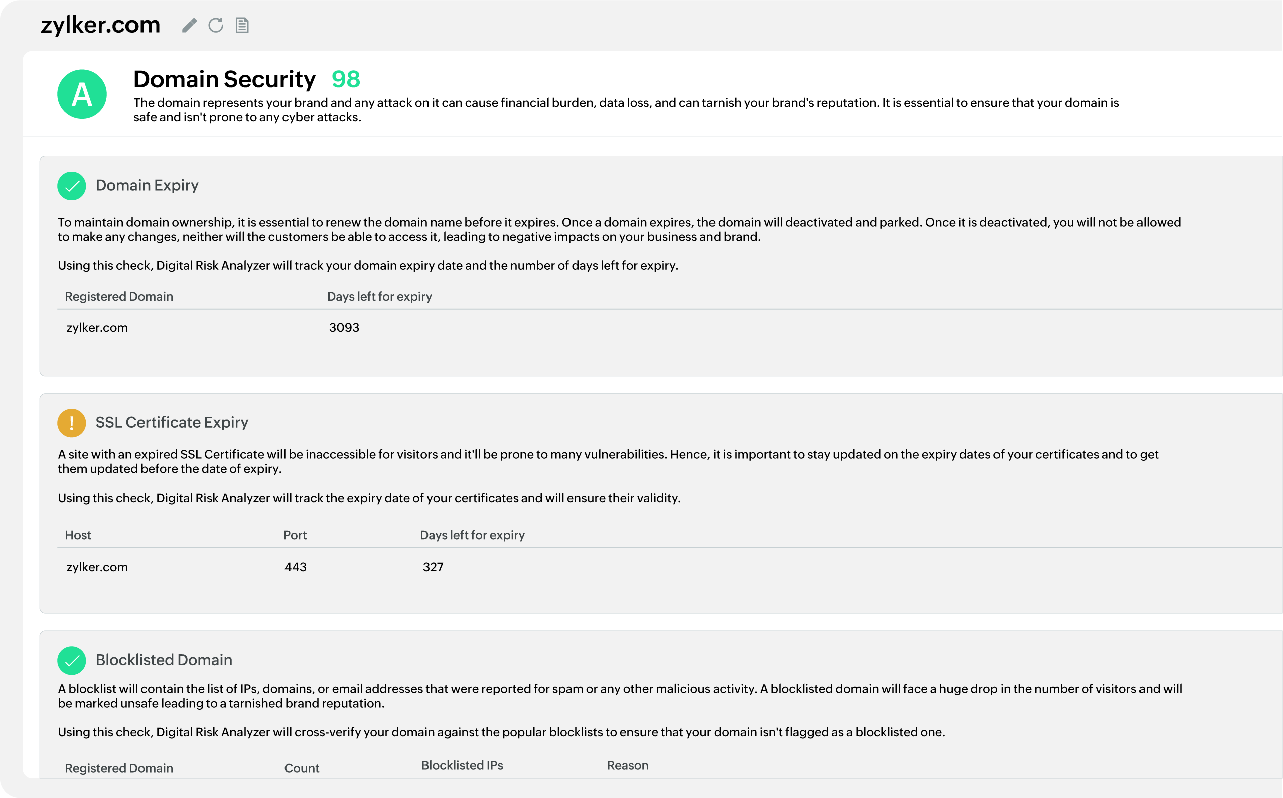Obtain visibility into your organization's or vendor's security posture, run third-party risk assessments, trace plausible cyber risks, take corrective actions, and create a perfect web security strategy. Digital Risk Analyzer, our cyber risk assessment tool, can help you gain complete visibility into multiple aspects of a domain's security and help you stay away from cyberthreats.