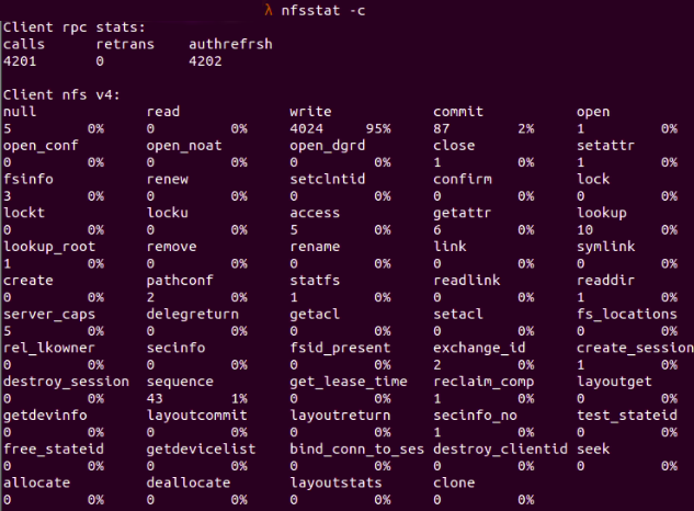 Lo último que debemos comprobar es el rendimiento del cliente NFS. Por ejemplo, podemos ejecutar nfsstat -c para comprobar los datos del cliente NFS. Estos incluyen el número de confirmaciones o escrituras realizadas o el número de retransmisiones para las solicitudes RPC. Si el número de retransmisiones entre el cliente y el servidor es enorme, lo más probable es que el servidor está ocupado o hay una pérdida en el pocket. El número de retransmisiones se muestra como retrans in the client rpc stats part.