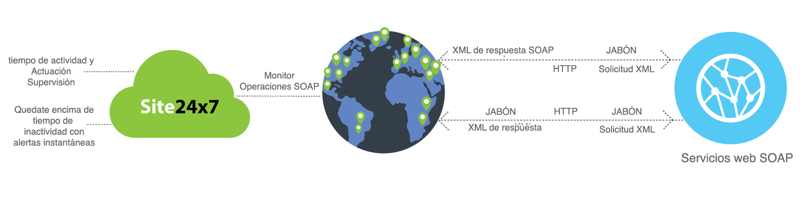 Obtenga visibilidad global del tiempo de actividad y el rendimiento de sus servicios web SOAP mediante el seguimiento del tiempo de respuesta y el rendimiento a nivel global desde nuestras más de 120+ ubicaciones de monitoreo.