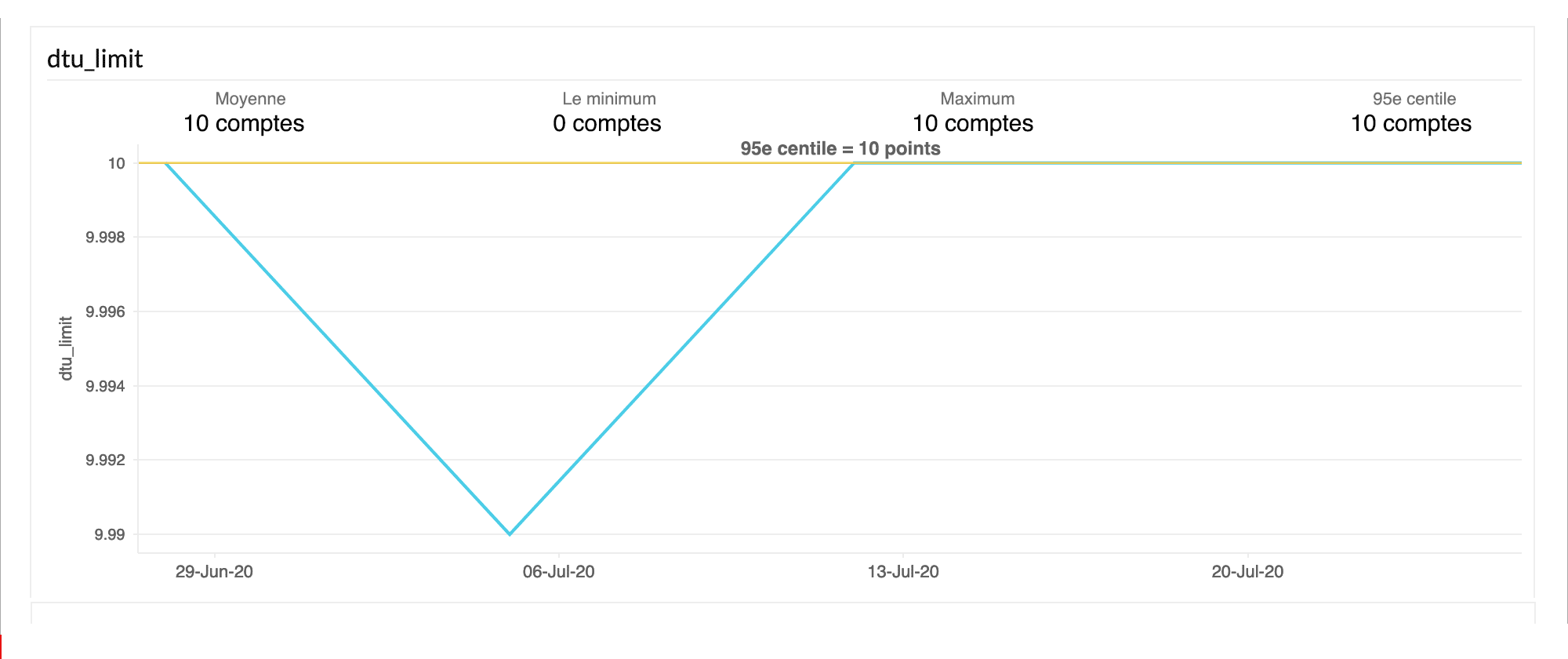 Identifiez si votre base de données a une capacité excédentaire ou si elle a atteint le maximum de ses ressources en obtenant des informations sur les indicateurs de performance clés comme l'utilisation DTU (mesurée comme une combinaison de l'utilisation du processeur, des E/S et de la mémoire dans votre base de données) et l'utilisation R/W. Restez alerté avant que la capacité maximale ne soit atteinte et assurez l'efficacité générale des performances en obtenant une visibilité sur la consommation des ressources.