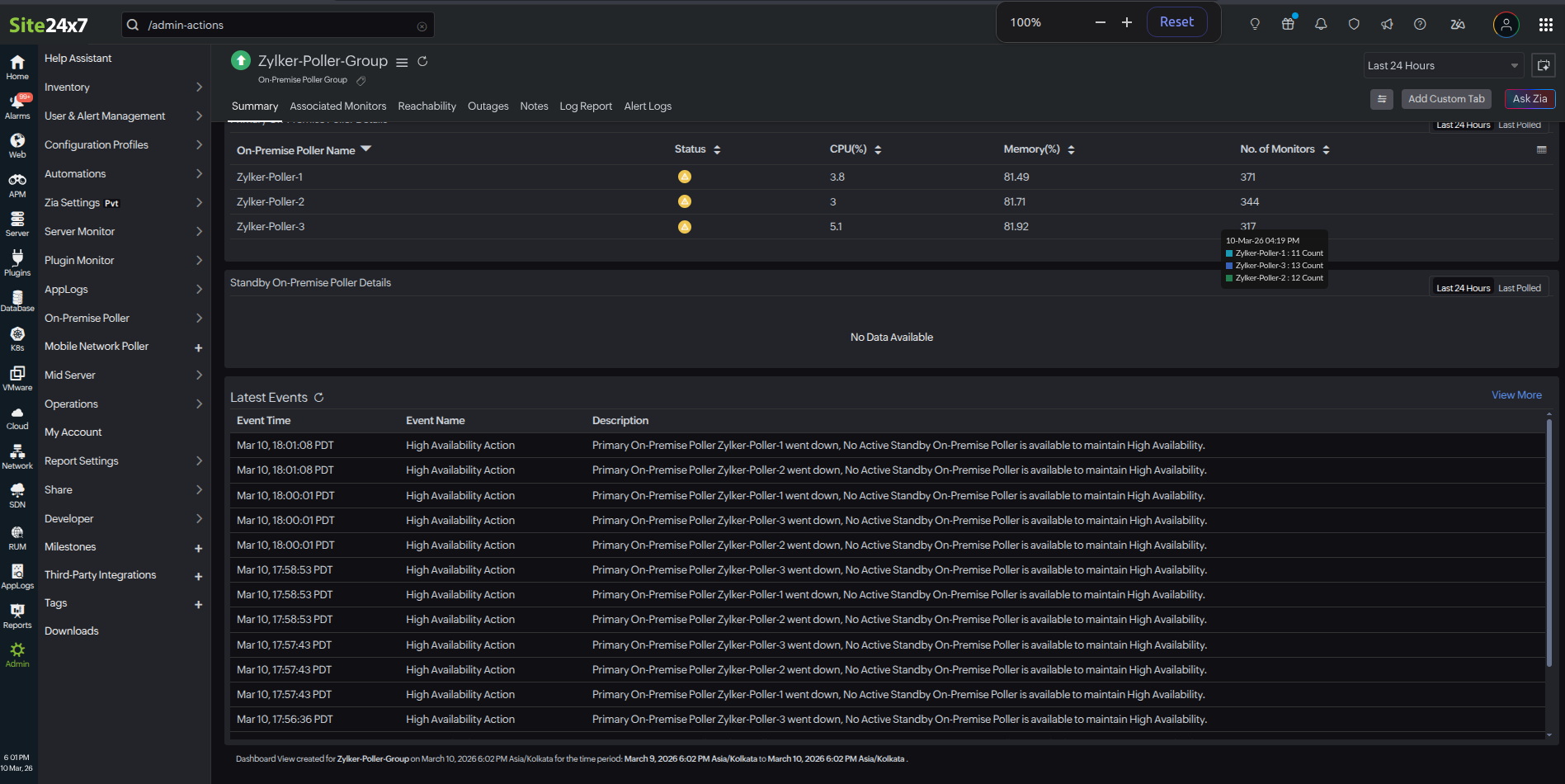 | Standby On-Premise Poller Details | The list of standby On-Premise Pollers with their Status, CPU (%), Memory (%), and number of monitors |