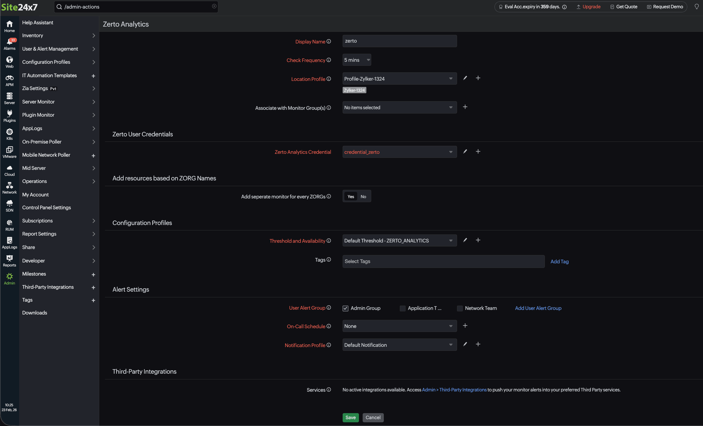 - Navigate to Admin > Inventory > Add Monitor > Zerto Analytics.
