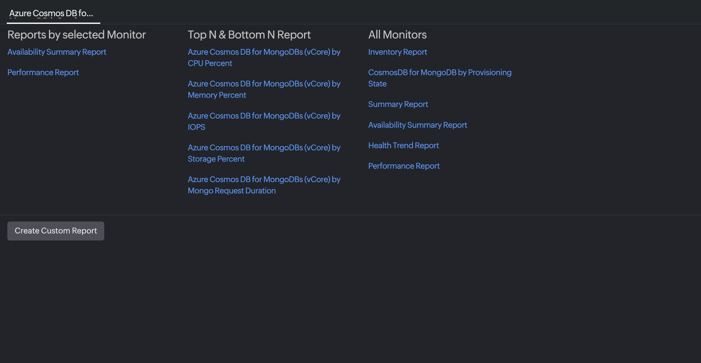 You can find the Availability Summary Report, Inventory Report, and Performance Report for one selected monitor, or you can get the Summary Report, Availability Summary Report, Health Trend Report, and Performance Report for all the Cosmos DB for MongoDB (vCore) monitors.