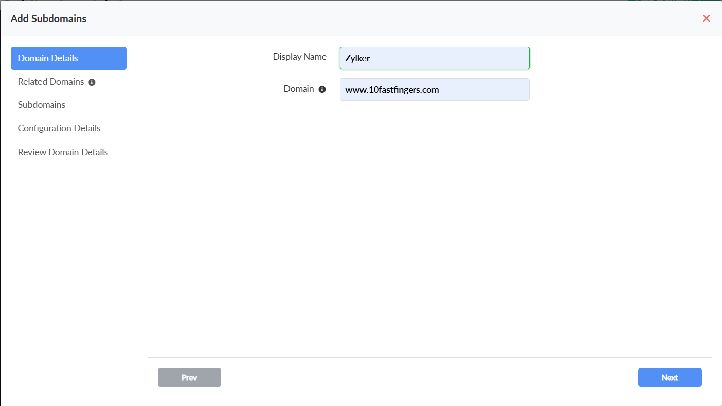 - On the Add Subdomains form, in the Domain Details section, provide the Display Name and Domain details, and click Next.