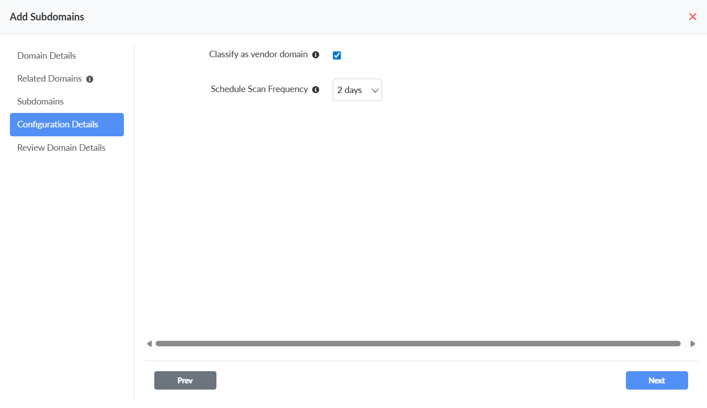 - On the Configuration Details page, you can classify your domain as a vendor domain and set the scan frequency for your configured domains, then click Next.