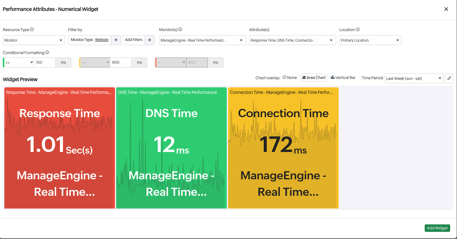 • Chart Overlay: You can select either an Area Chart or Vertical Bar to display the performance metrics trend behind your numerical widget.
