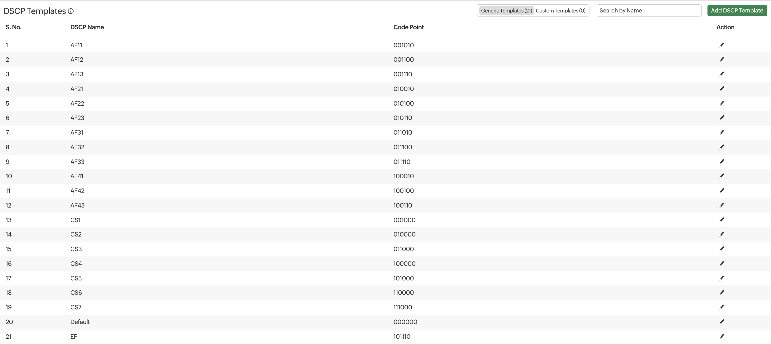 DSCP templates are classified as Generic Templates, ones available by default, and Custom Templates, ones that users add. You can toggle between the two types of templates and view the list of all templates.