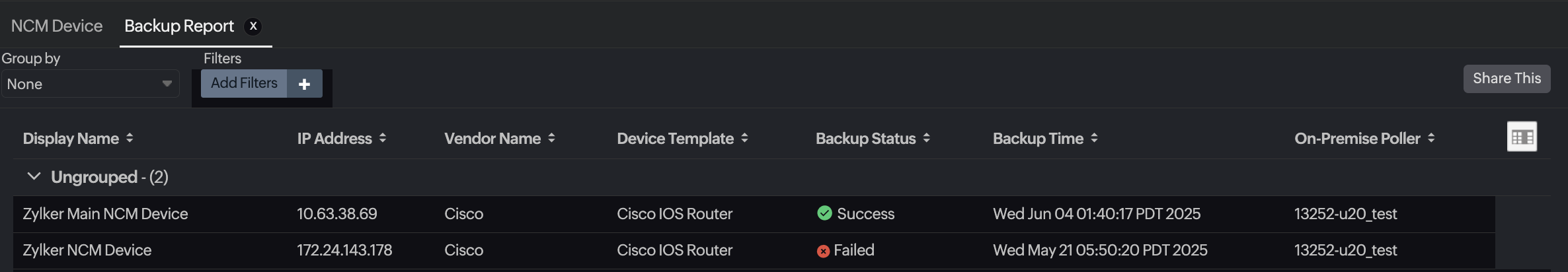 The Backup Report provides a summary of the configuration backup status for all your network configuration management (NCM) monitors. This report allows network administrators to verify that device configurations are backed up regularly and successfully.