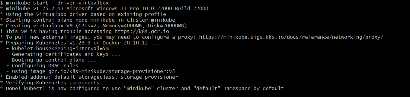 minikube start --kubernetes-version='v1.25.2' \\ --driver='virtualbox' --memory=8196 -p gitops