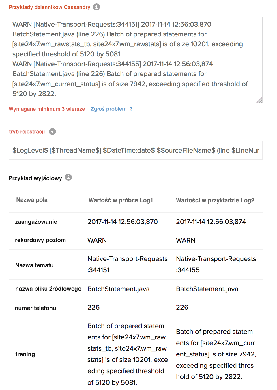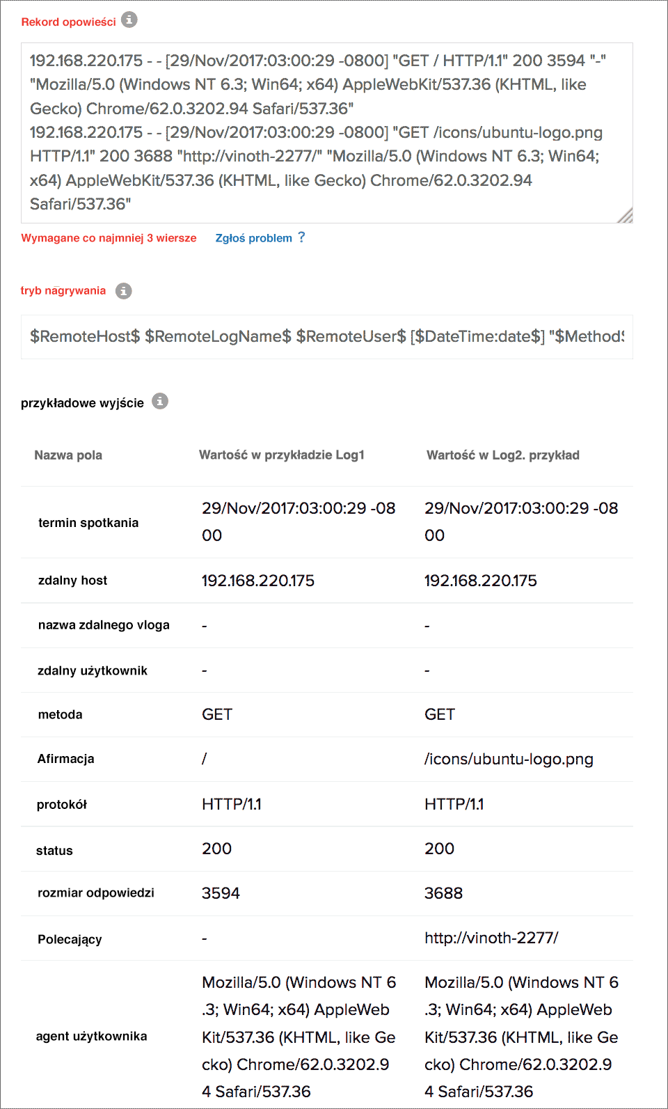 Wszystkie typowe dzienniki aplikacji (np. IIS, Cassandra, Apache, NGINX itp.) i środowiska rejestrowania (np. Log4j, Log4Net i NLog) są rozpoznawane automatycznie. Można również zdefiniować własny wzór dziennika, który można zapisać jako format niestandardowy. Dzienniki objęte dowolnym formatem domyślnym lub niestandardowym będą automatycznie pobierane podczas automatycznego wykrywania. Można również pobierać pliki dzienników ze zdalnych serwerów i zarządzać nimi.