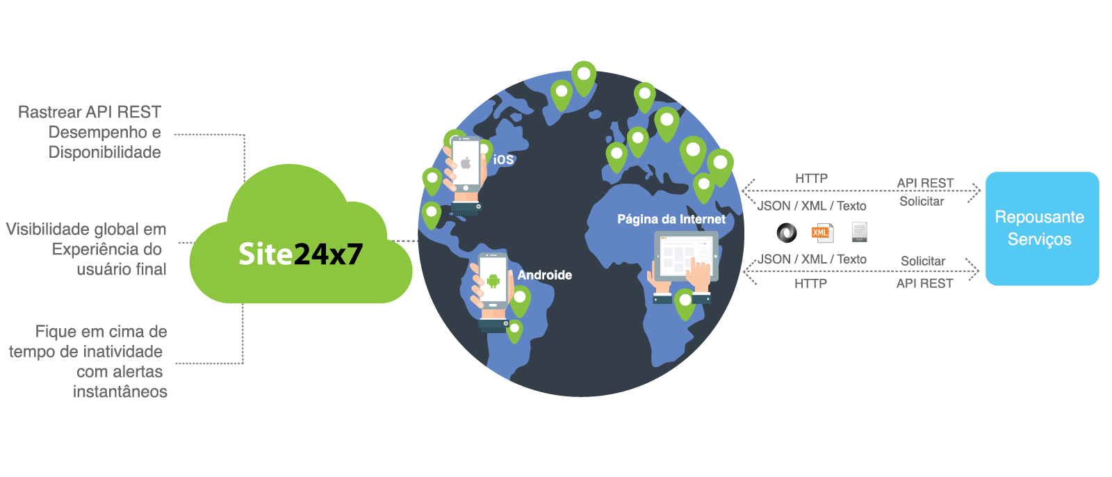 Analise todos os aspectos do desempenho da API REST e mantenha o controle dos problemas com notificações instantâneas por e-mail, SMS, chamadas de voz e mensagens push.
