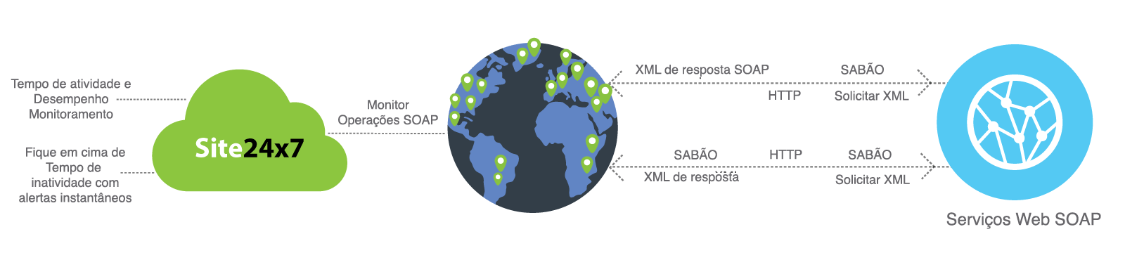 Tenha visibilidade global do tempo de atividade e desempenho de seus serviços SOAP web controlando o tempo de resposta e a taxa de transferência globalmente de nossos mais de 120+ locais de monitoramento.