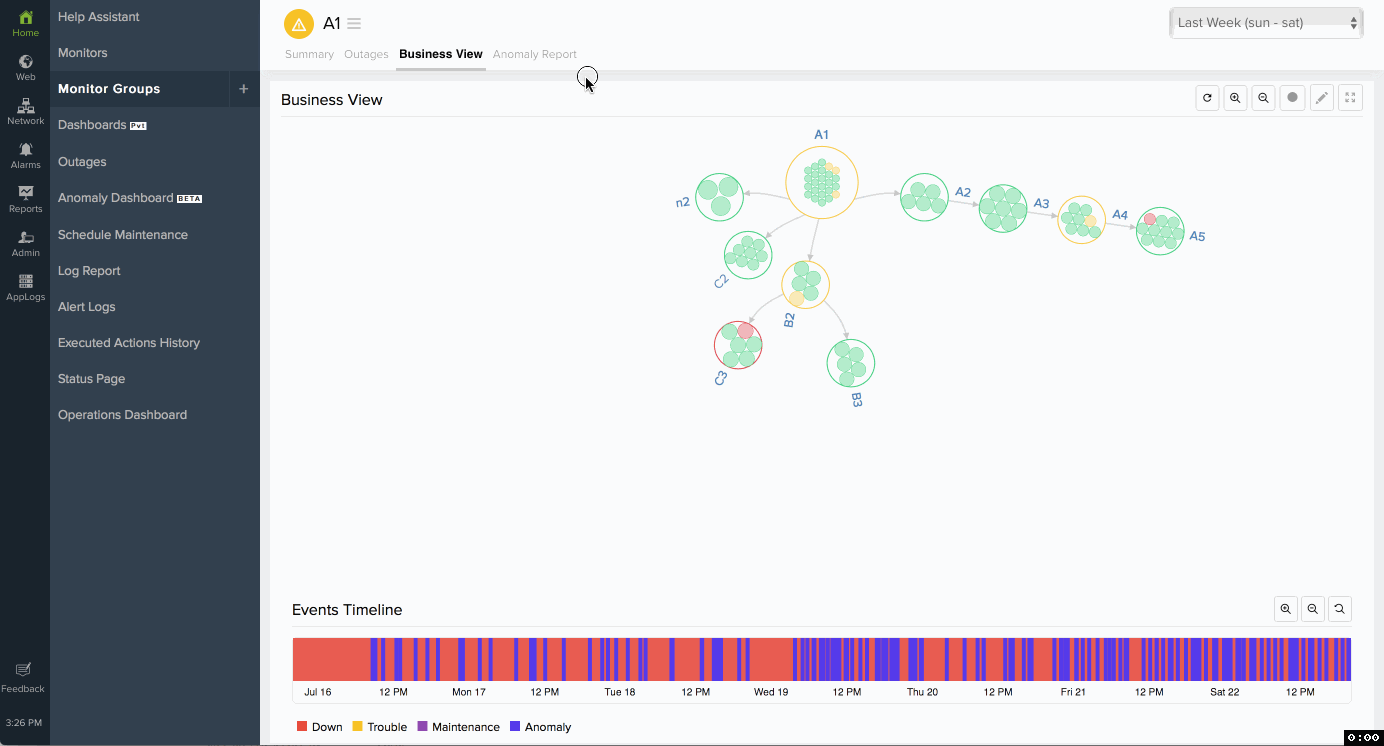 Monitor Group is a handy concept that enables you to seamlessly organize your monitored resources and ease administration. It lets you organize resources (Monitors) by business application, geography, type, resource ownership, and more. Let's say you've a web application that uses certain databases, application servers, and physical servers for hosting the service. Now with the "Monitor Group" concept, you can quickly assemble all these resources under a single bracket and thus, facilitate in general reporting and also help gain insight into the real-time and historical operational trends of individual resources and group during an outage. Additionally, you can also add nested Subgroups upto level five under a main monitor group and thus, visualize all your monitoring resources using a Business View. Business View clearly serves the purpose of representing the status of a "Business Application" in this context.