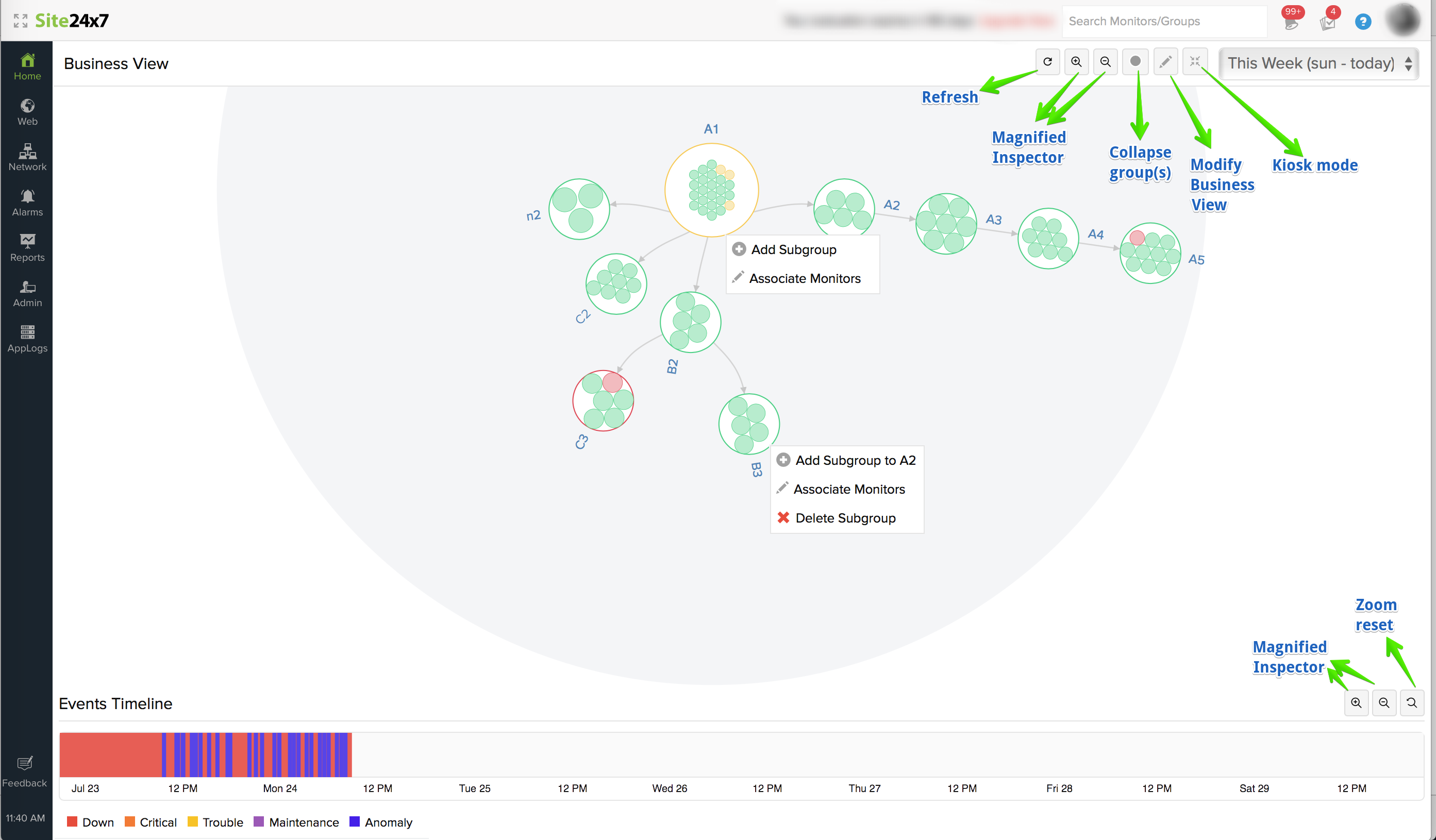 Business view allows you to easily filter out details about availability of individual monitors, monitor groups and subgroups. It has an inbuilt Collapse/Expand Group(s) tool   and Magnified Inspector. The  can be used to collapse or expand the Monitor Subgroups. In this view–whenever a monitor subgroup is DOWN, the circle intermittently blinks red to capture your attention. The parent Monitor Group will never collapse, though. Similarly, the Magnified Inspector tools can be used to zoom in and zoom out  of individual Monitor Subgroups, to gather accurate monitor status of individual monitors in the Monitor Group. Every monitor in a monitor group / subgroup are depicted as a circle, with each circle color coded to showcase the current monitor status. Red circles are identified as DOWN, orange circles are CRITICAL, yellow circles are TROUBLE, and green circles are UP. Details about the number of Active Monitors and status of individual monitors in each subgroup can be obtained by simply hovering over each circle. In the business view, the individual subgroups will be rendered as circles with the outer boundary of each circle color coated to depict the group's status. If you wish to set the default business view, just click the Refresh button. In the default view, you can view the expanded circle with all the monitor circles in a single shot.