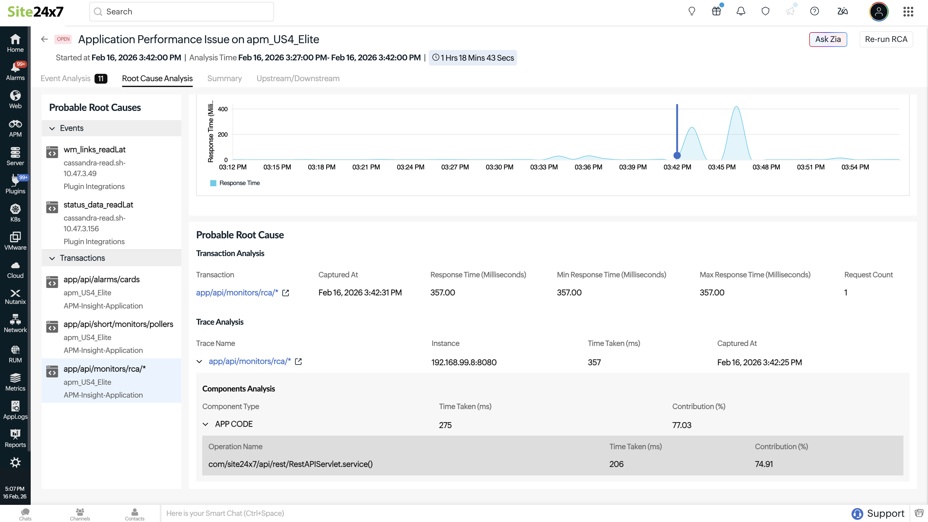 - Trace Analysis: A deep drill-down capability (supported only for APM) that pinpoints the exact transaction, component, or method contributing to the issue.