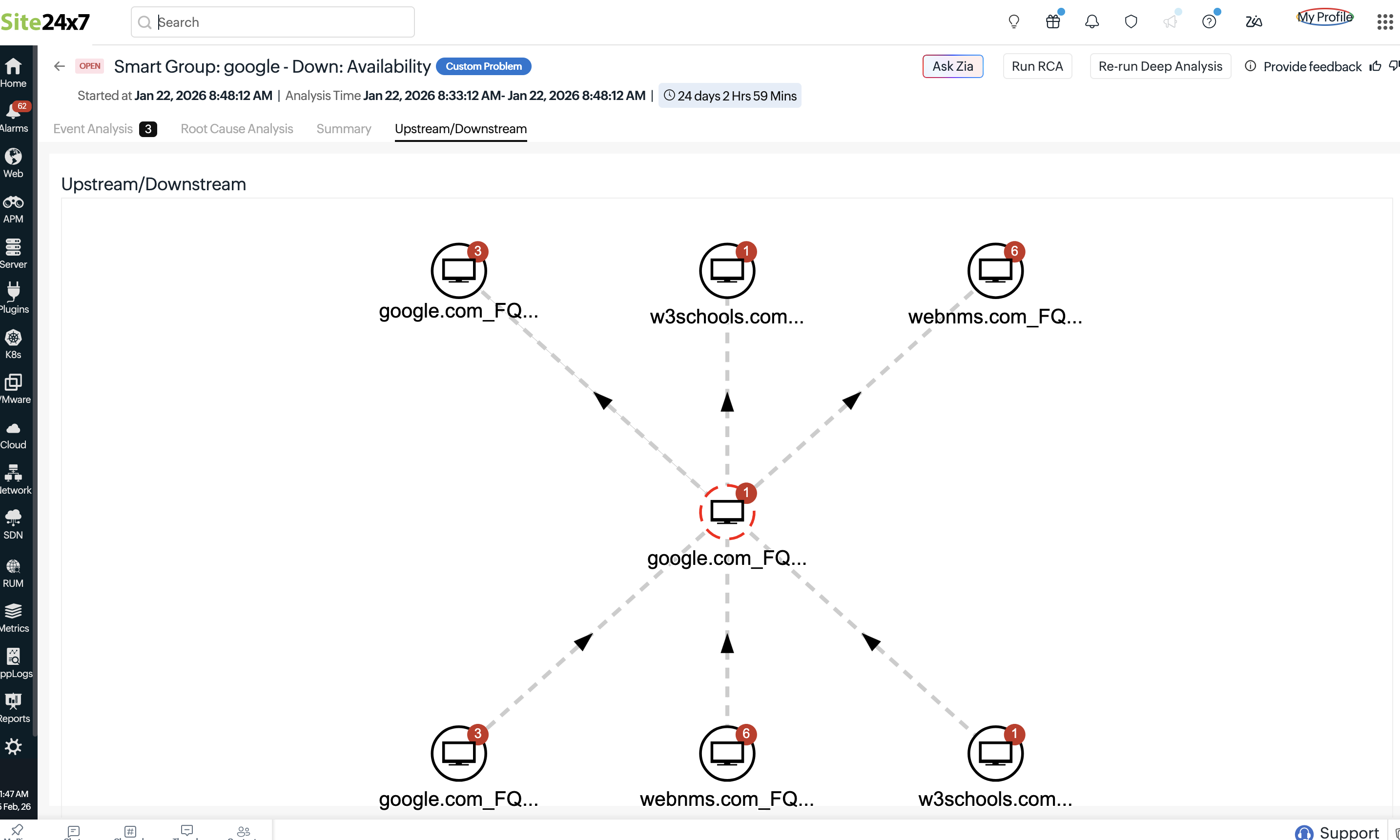 This pattern is identified by Site24x7 and related events are correlated into a single consolidated Problem. Along with event correlation, Problems expose a set of probable root cause events, help assess impacted components, and enable prioritization of resolution.