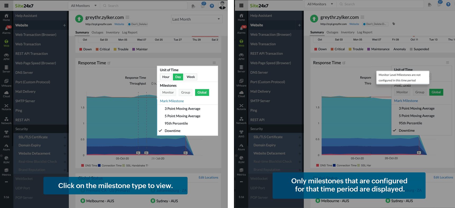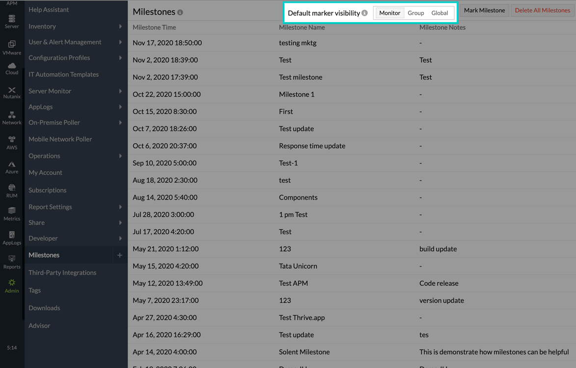 Milestone markers can be created at individual monitor level for website, server or APM monitors.