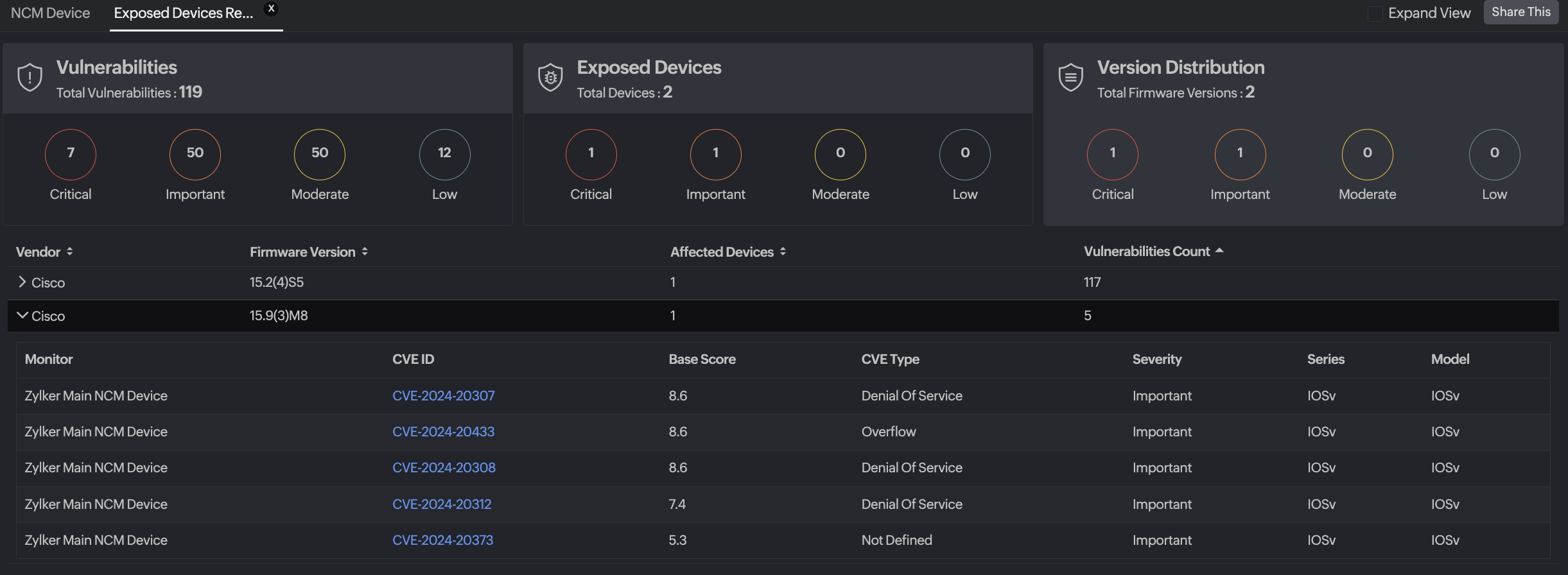 This report displays vulnerabilities grouped by the firmware version to help you assess the scale of the exposure.